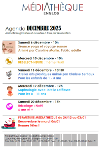 Voici le planning d’animations pour le mois de décembre 2025. Toutes les animations sont sur inscription,…