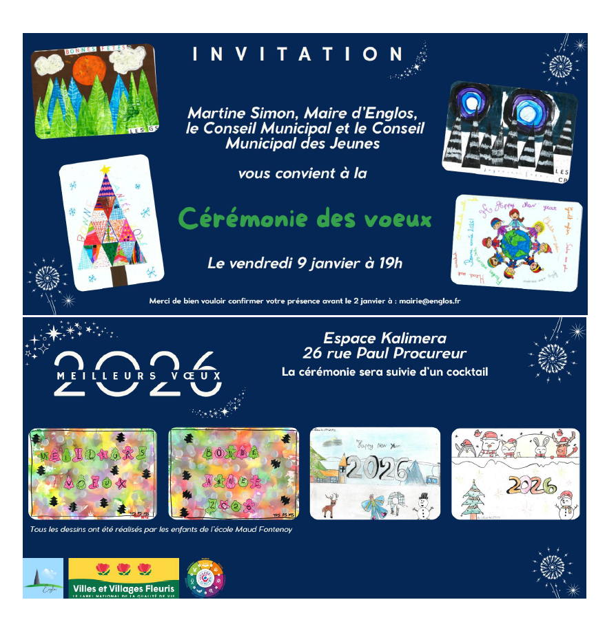 Martine Simon, Maire d’Englos, le Conseil Municipal et le Conseil Municipal des Jeunes vous convient à la Cérémonie des vœux le vendredi 9 janvier à 19h.